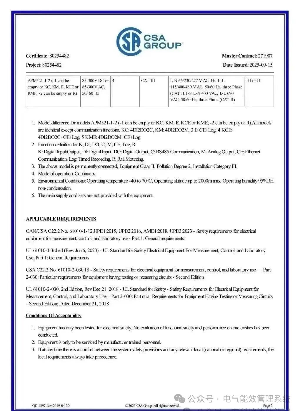 The APM521 is designed with full consideration of electrical safety and environmental adaptability. Its voltage and current inputs feature overload protection, and the auxiliary power supply supports a wide input range of AC/DC 85-300V. The meter complies with multiple certification standards including UL, CE, and CPA, making it suitable for power system environments in different regions.