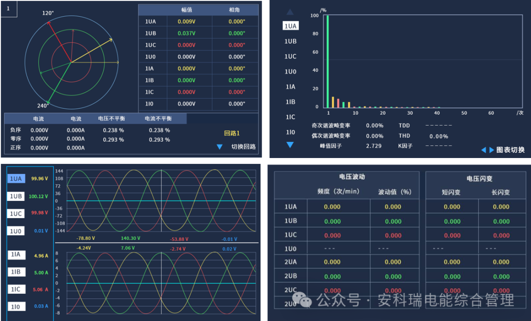 Measurement of voltage, current, power, electric energy, etc.; voltage deviation; voltage unbalance; current unbalance; harmonic voltage/harmonic current; interharmonic voltage/interharmonic current; harmonic power; harmonic phase angle; total harmonic distortion (THD); high-frequency harmonics; voltage fluctuation and flicker; rapid voltage change. Monitoring data is displayed on the device interface, allowing viewing of real-time waveforms and fault waveforms.